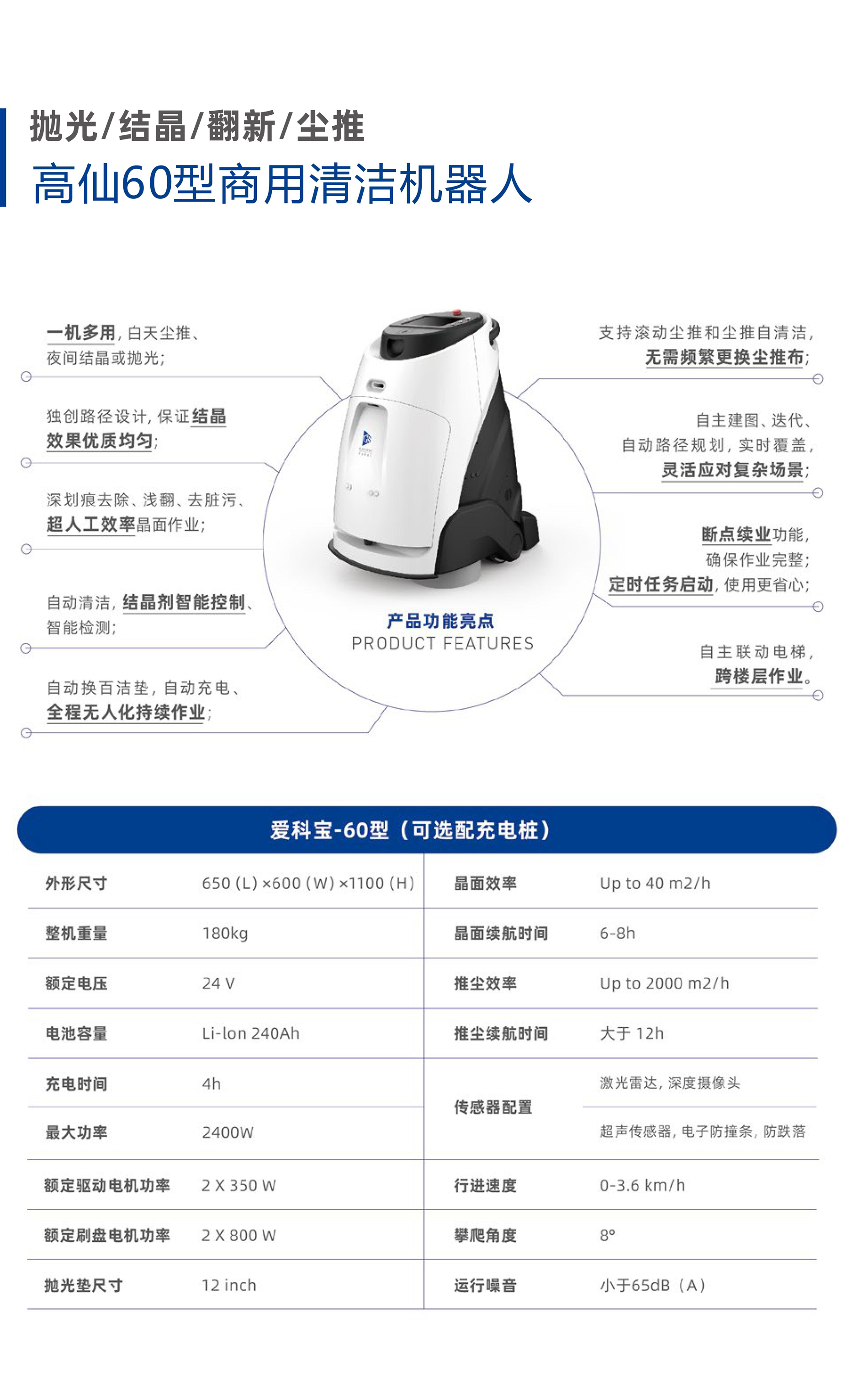 一款專為地面拋光、晶面、翻新等日常養護同時具備超長續航推塵等多功能的一款商用清潔機器人。